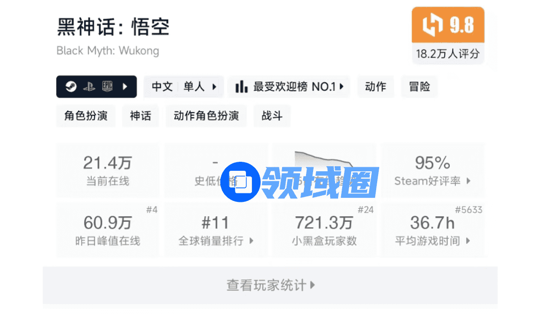 同时作为Steam国区销量的重要参考,小黑盒当前的《黑神话》玩家数为721.3万。
