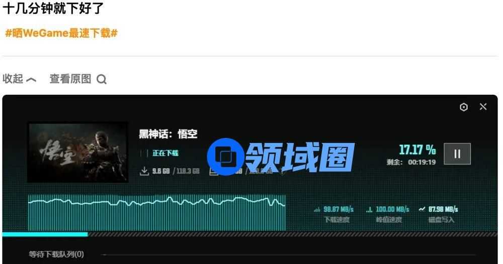游戏下载方面,WeGame提供了专门的高速下载支持。《黑神话》近120G的体量,社区上很多玩家下载速度达到了90~100M/秒,不少玩家十几分钟就下好了。