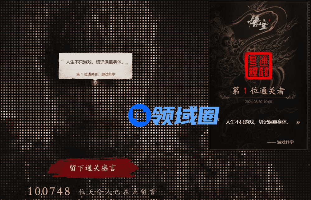 更有意思的是,WeGame还同步推出了BOSS留言系统,与之前的通关留言墙相呼应。通关留言墙上,每位玩家的留言化为一个像素点,最终汇集在一起组成了天命人的形象。天命人眉宇间的像素,就是游戏科学写下的第一句通关留言:人生不只游戏,切记保重身体。