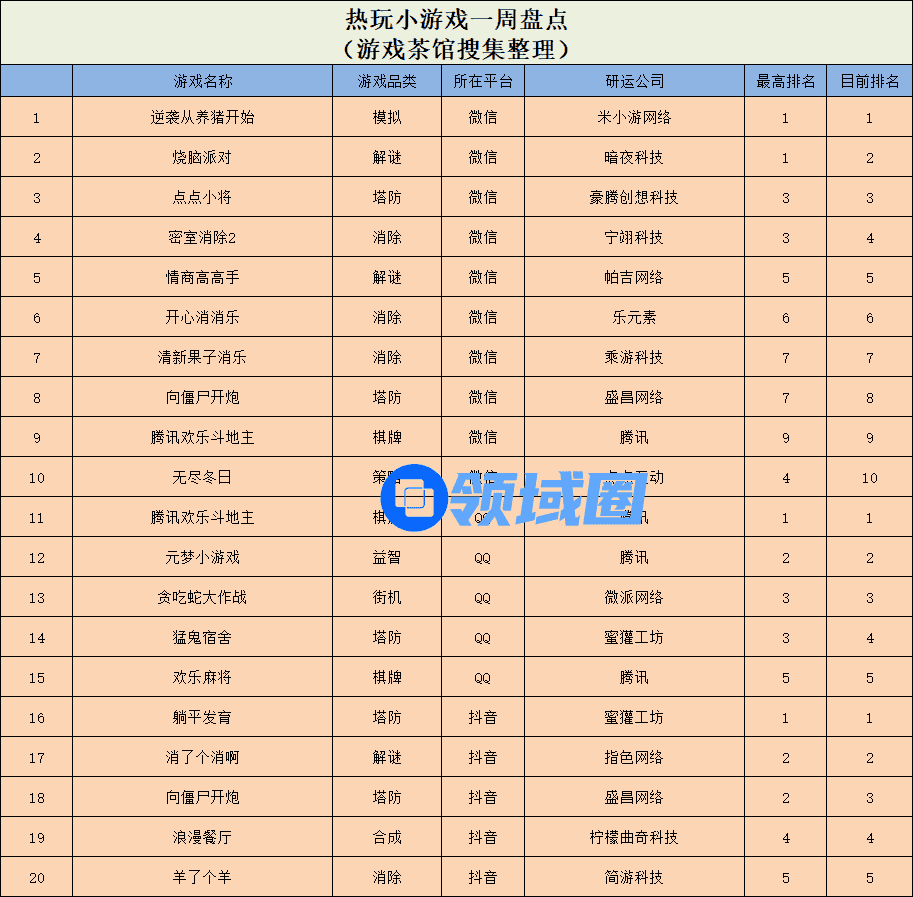 微信小游戏人气榜单中,模拟经营小游戏《逆袭从养猪开始》冲上人气榜魁首,解谜玩法的《烧脑派对》和豪腾创想科技发行的《点点小将》,分别拿下榜单第2和第3名。此外,最近登录小游戏平台的国民消除游戏《开心消消乐》,本周也拿下了人气榜第6的好成绩。