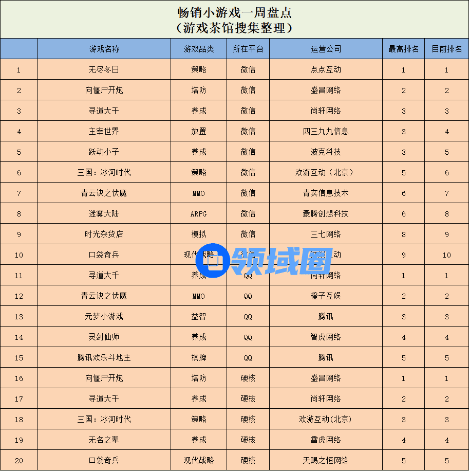 在硬核小游戏畅销榜单中,大梦龙途的塔防小游戏《向僵尸开炮》又一周稳稳拿下魁首,三七互娱旗下的《寻道大千》和欢游互动的《三国:冰河时代》分别位列榜单第2和第3名。同样来自三七的《无名之辈》本周也拿下了畅销榜TOP4的好成绩。