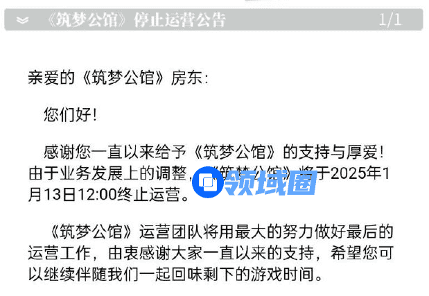 公告显示,《筑梦公馆》将于2025年1月13日12:00正式停止运营,并给出了将游戏内充值货币双倍兑换为绑定货币至蓝港在线旗下其他在运游戏内的补偿措施。