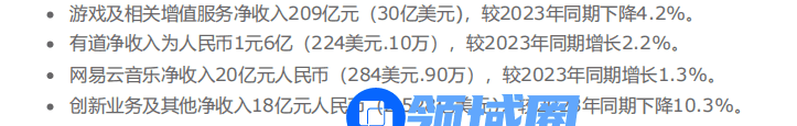 2024年Q3,网易游戏及相关增值服务净收入为209亿元(30亿美元),环比增长4.0%,同比下降4.2%。