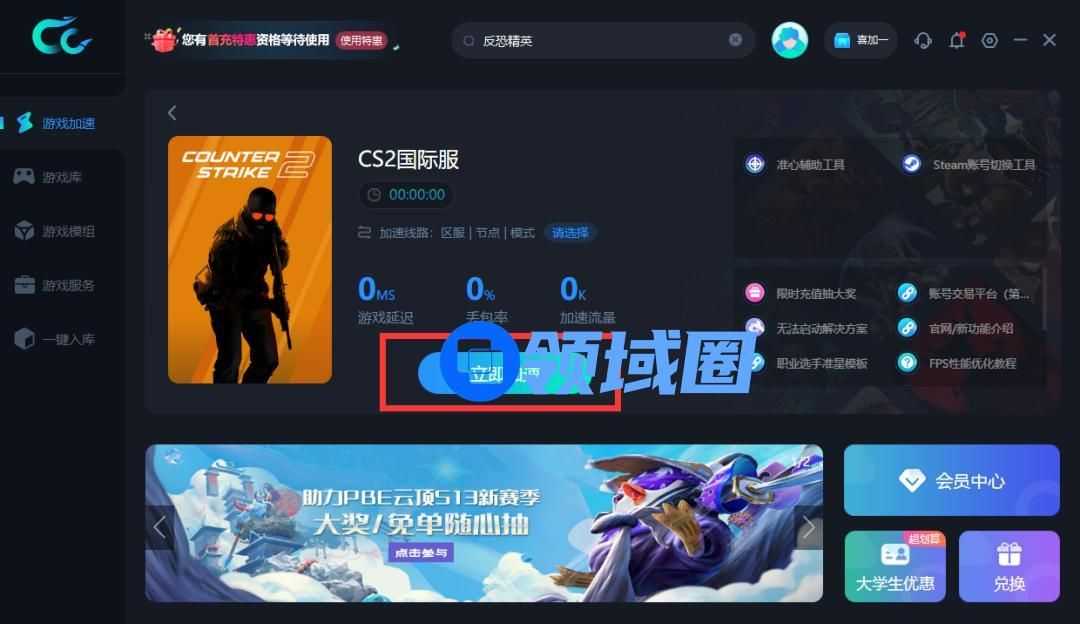 端游加速教程:打开CC加速器PC电脑版---搜索“反恐精英2”或者“CS2”---点击【立刻加速】