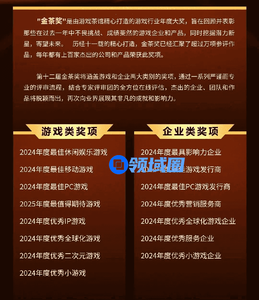作为一年一度的游戏行业年度大奖,今年,第十二届金茶奖报名也已开启,本届金茶奖共设置了8项游戏类奖项和7项企业类奖项,具体奖项如图: