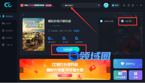 端游加速教程:打开CC加速器PC电脑版---搜索“模拟农场25”---点击【立即加速】