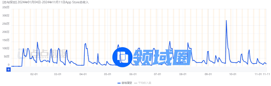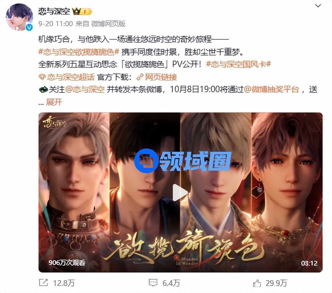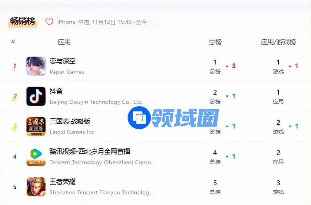 这也是自今年1月上线以来,《恋与深空》第二次登上总榜第1。今年9月23日,该款游戏便曾凭借“欲揽旖旎色”国风主题混池冲进畅销榜第1。据Sensor Tower,《恋与深空》在当日迎来上线以来的流水最高值,9月收入提升29%,成为国内App Store收入排行榜第6。点点数据显示,仅在9月23日,游戏在国内iOS端便日收超2000万元。今日营收数据尚未出炉,不知道《恋与深空》的日流水能否再创新高?