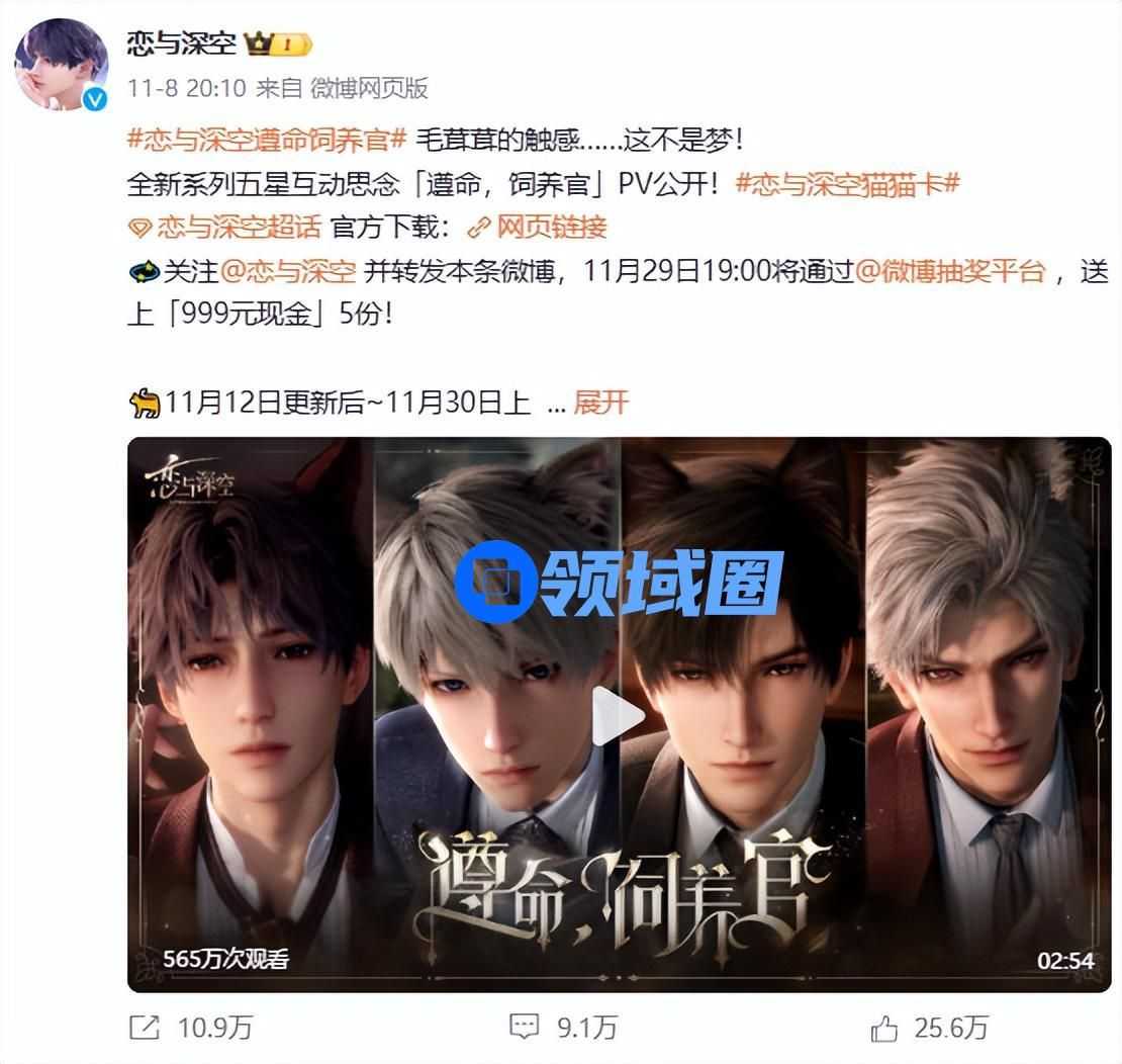 《恋与深空》在今日上线“拟猫”主题混池“遵命,饲养官”,在所有角色的主题限定五星卡面和玩家的加持下,开服后不到10小时,《恋与深空》提升26名来到游戏畅销榜第1,并超过抖音成为总榜第1。