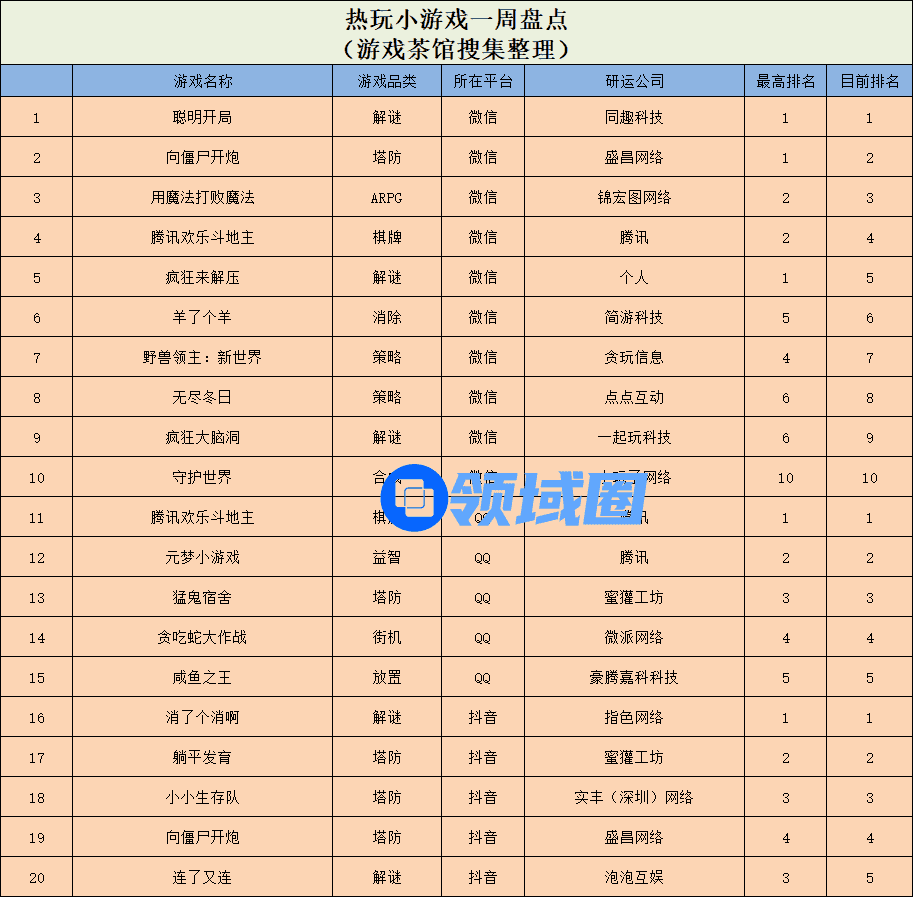 微信小游戏人气榜单中,同趣科技推出的益智解谜游戏《聪明开局》空降魁首,大梦龙途的塔防小游戏《向僵尸开炮》和ARPG玩法的《用魔法打败魔法》,分别拿下榜单第2和第3名。此外,还有两款产品在本周冲上了人气榜TOP10,它们就是当前位于榜单第7的《野兽领主:新世界》和第10名的《守护世界》。