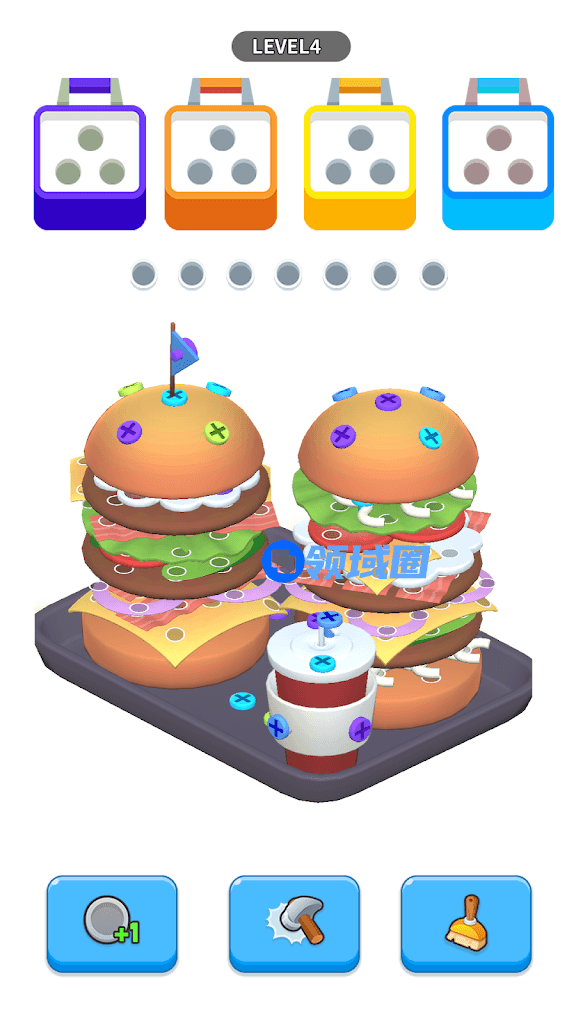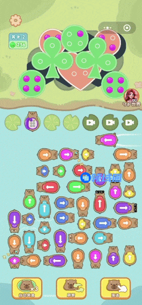 《聪明开局》是一款融合华容道和拧螺丝解谜玩法的产品,该游戏选用了“卡皮巴拉”这个网红题材对游戏进行包装。游戏中,拧在层叠铁片上的螺丝有各种不同的颜色,只有对应颜色的车辆停到“荷叶”上,这些螺丝才会被拧下,最终玩家只要通过指挥车辆,解开所有铁片即可通过关卡。
