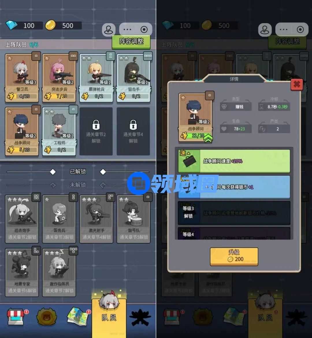 关卡外,玩家可以耗费对应角色碎片和金币对角色进行升级,还可以在已经获取的英雄中进行选择和组合,搭建上场的英雄阵容。