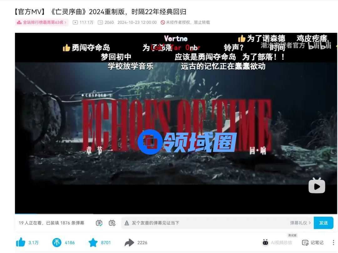 就是这样一首22年前的曲子,最近却在B站上又火了一把。10月24日,Dreamtale乐队官方改编的重制版《亡灵序曲》在B站收获了一百多万的播放和几十万的点赞,在视频刚发布时,同时观看人数就突破千人,评论区充满了对那个时代的怀念和对魔兽IP的热爱。