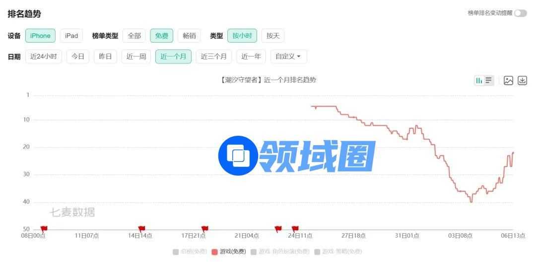公测开始后,《潮汐守望者》的免费榜成绩一度冲到第5名,并在前10保持了数天,目前也稳定在20到30名左右的位置。畅销榜成绩则低开高走,一路攀升至30名上下,并呈现增长趋势。对于一款明显针对垂直玩家的长线产品来说,这个成绩算得上是一个好的开始。