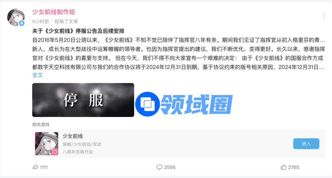《少女前线》或许是近年国内停服的最大二游IP,“少女前线宣布停服”词条也在昨天冲上热搜。这个消息令许多玩家猝不及防——一款运营八年、总流水合计数十亿的老牌二游为什么会突然选择停服?