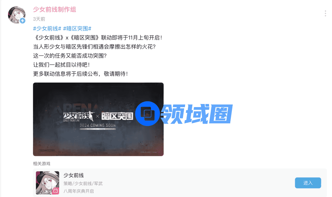 这次停服的突发感也很强。与其他停服游戏不同,《少女前线》今年的活动更新频率高,剧情也正值高潮阶段,前几天还预告了11月上旬和《暗区突围》的联动活动。