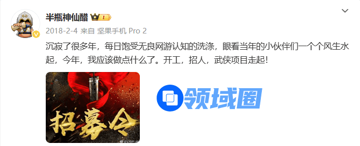 2018年,醋大“重出江湖”,沉寂多年的微博重新更新。那时,他在接受采访时谈到《大侠立志传》的初衷,