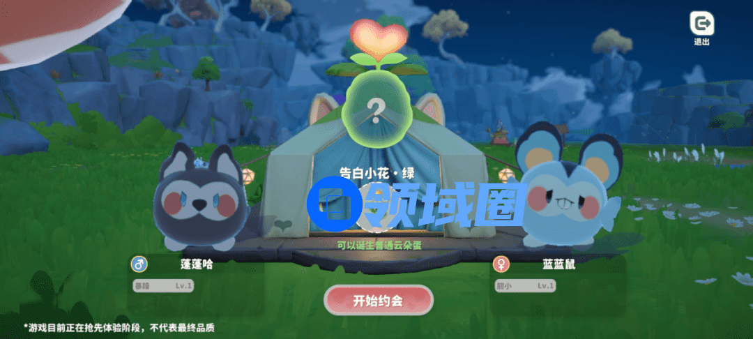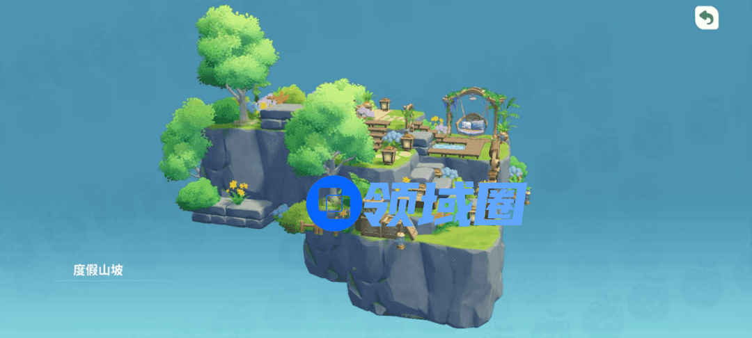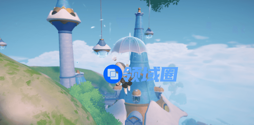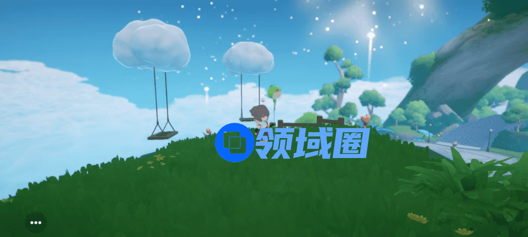 山坡上悬空挂着两架云朵秋千,秋千旁有两株甜蜜百合,百合被触碰,能从中绽放出烟花。