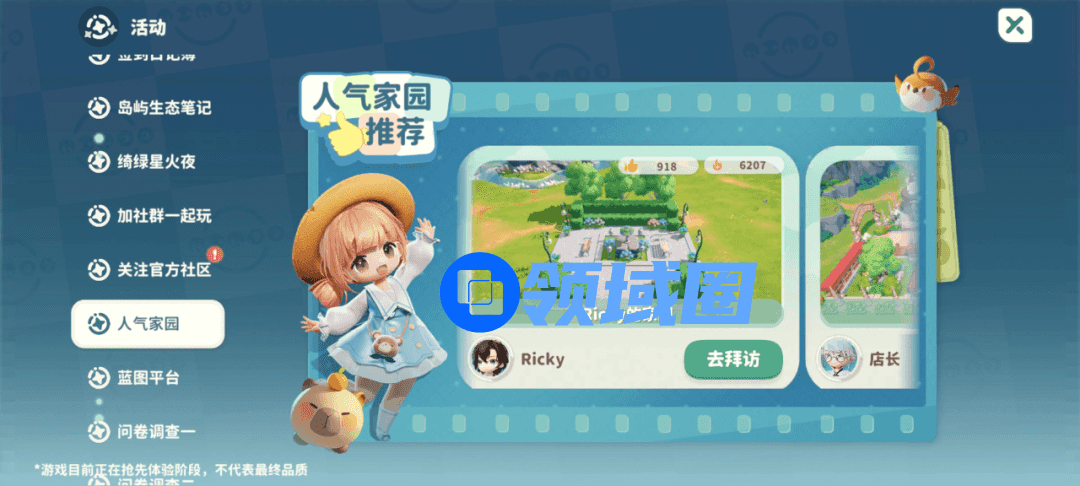 同时,正如前面所述,剧情任务的堆叠让玩家进入多人区域后无心社交,让偏好独自游玩的玩家感到安心的同时,也会让喜爱社交的玩家找不到结伴游玩、打卡风景的契机。整体关于“社交”的设计较为克制,目前游戏内社交玩法主要提供“姆友推荐”、“拜访好友家园”和“人气家园推荐”,