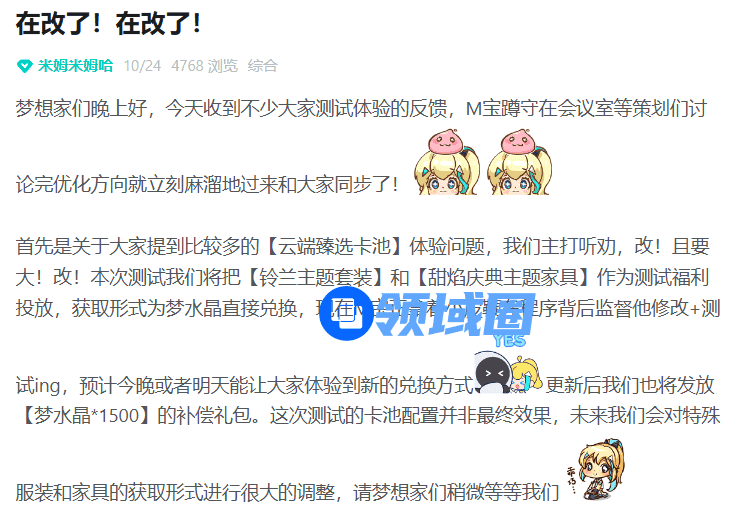 面对这一问题,测试当晚,项目组紧急发布公告将卡池外观作为测试福利发放,让玩家用梦水晶即可兑换服饰。并表示未来将会对特殊服装的获取形式进行很大调整。