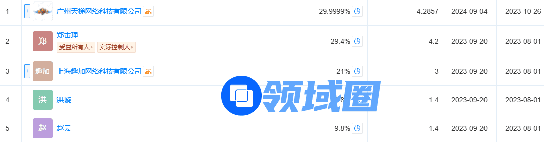 2023年8月,随着上海趣糖发生股权变更,郑宙理成为大股东,他的新去向终于落定。同时,他的新项目也获得游戏资本青睐。据三方平台,目前这家2022年成立的公司,曾从2023年10月陆续获得广州天梯网络三次投资。广州天梯网络目前股份占比近30%。上海趣加也是游戏股东之一,累积两次投资,占股21%。