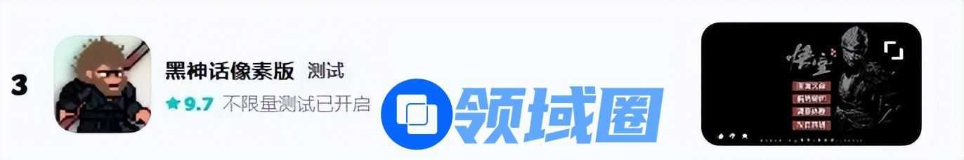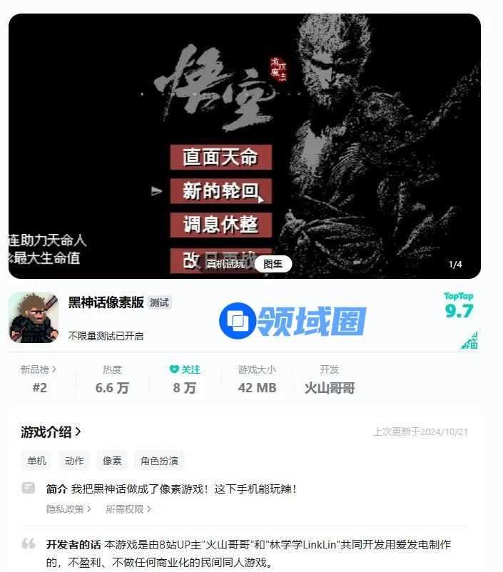 10月21日,《黑神话像素版》上线TapTap,获得9.7分评分,冲上热门榜第三,新品榜第二。