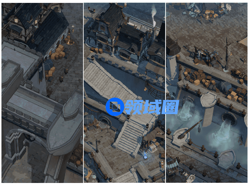 难点是工业化的城市适合表达黑帮,但同时需要在传统奇幻的背景下把握科技程度,城市感的表达也是难点。在翻找了大量资料后,在传统建筑室内外和街景上增加了航海元素还有管道工程等来体现时代特点。下水道就是个同时能表达黑帮背景和科技程度的设计。城市感方面用了立体交通和建筑组合的形式,来凸显城市的拥挤市井氛围,也表现了截然不同的区域特色,从上城区的石制建筑到下水道的管道在场景设计上体现了人口阶级的差异化。