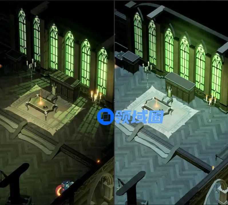 在移动设备高端机(左)、低端机(右)使用不同的光影方案和资产规格