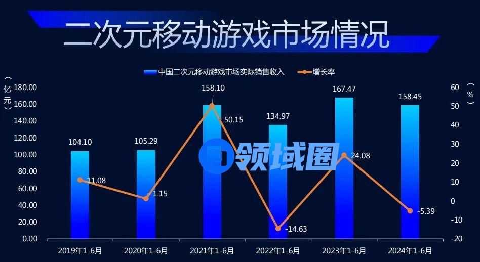 今年对于二次元游戏来说,是更加严峻的一年。据游戏工委发布的《2024年1-6月中国游戏产业报告》显示,上半年里二游实际销售额158.45亿元,同比下降5.39%。排除2022年特殊情况外,今年是近五年二游增速首度为负。报告归因于头部老游戏生命周期步入尾声,而新产品潜力未得到释放。
