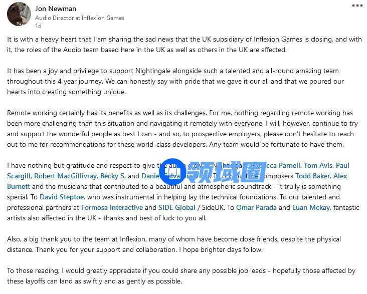 Jon Newman 表示:“我怀着沉痛的心情分享一个不幸的消息,Inflexion英国分部即将关闭,来自英国的音频团队以及英国分部的其他人都将受到影响。”