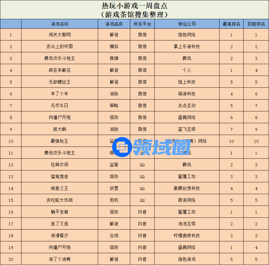 微信小游戏人气榜单TOP10中,指色网络的解谜游戏《闯关大聪明》拿下魁首,掌上乐游旗下的模拟经营游戏《舌尖上的中国》拿下第2,腾讯的经典棋牌《腾讯欢乐斗地主》和个人开发者的《疯狂来解压》则分别拿下榜单第3和第4名。同时,益智玩法的《最强枪王》也在本周成功跻身微信人气榜单前列,且其当前位于榜单第10名。