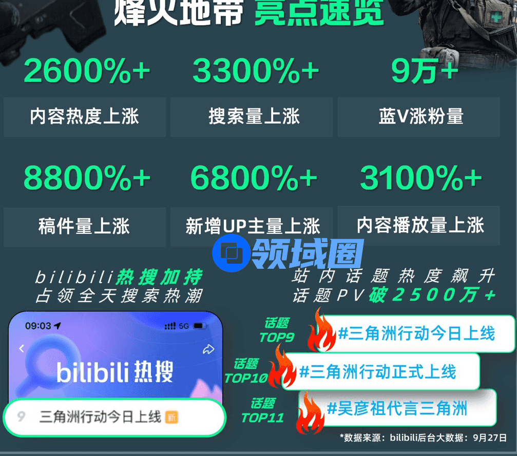 而伴随《三角洲行动》的正式上线,不仅玩家们的热情澎湃,B站UP主的创作欲望也好似瞬间被点燃,据官方数据,截止游戏公测第二天的9月27日,有关《三角洲行动》的投稿数量上涨了8800%,内容播放量也暴涨了3100%,其他数据也全部迎来指数级飞跃。