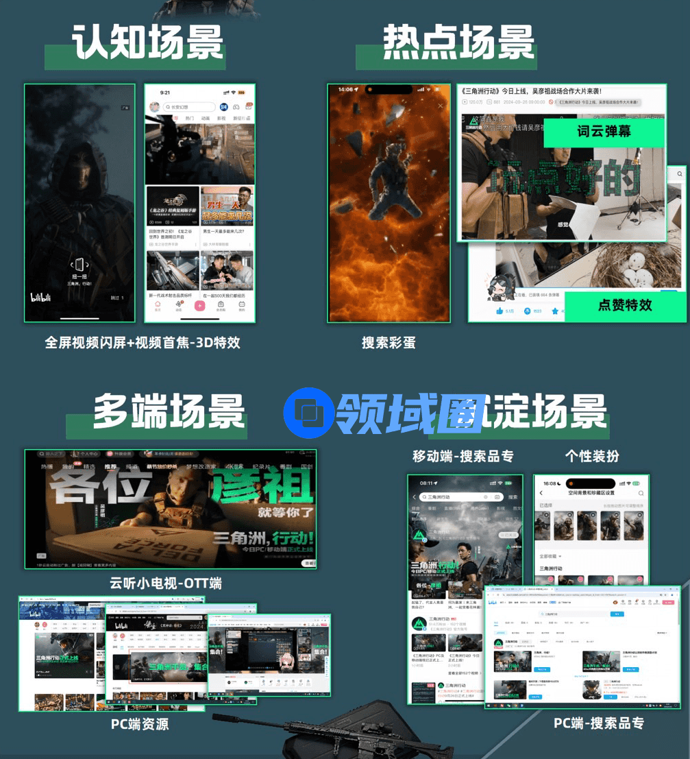 依然以《三角洲行动》在B站的整案宣发为例,首先是B站本身,在其移动端APP、网页端,为《三角洲行动》制作了移动APP开屏闪屏、信息流场景的专属3D特效,以及网页移动双端搜索菜单与弹幕点赞特效。