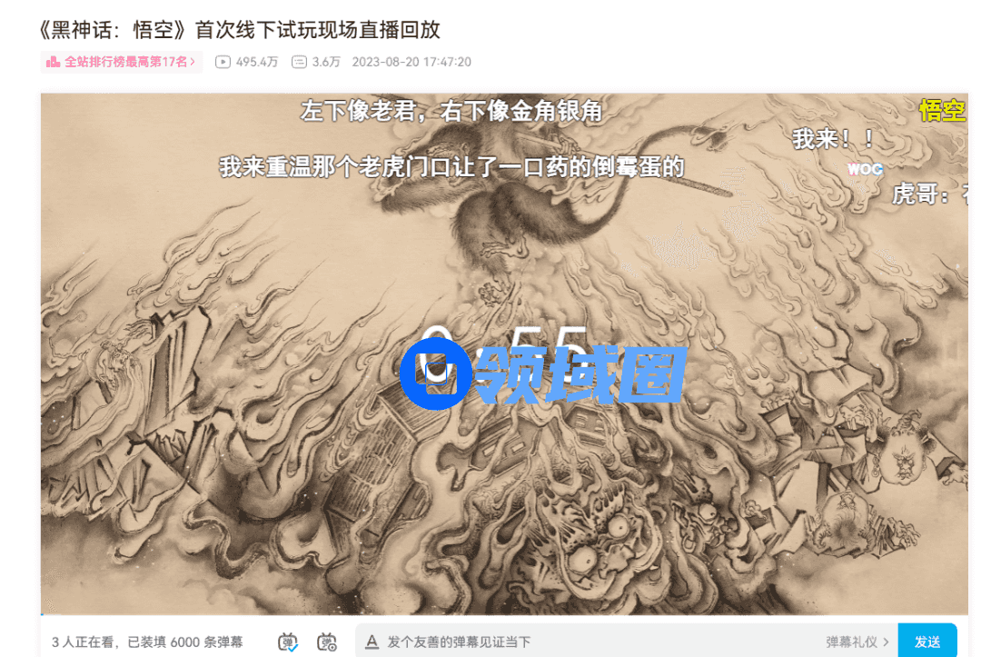 哪怕不说《三角洲行动》,《黑神话悟空》最初PV爆量也是在B站,而2023年8月20日《黑神话》首次线下试玩活动的B站独家直播,当天人气更是飙升到 2000 万以上,评论超过 2.2 万条。