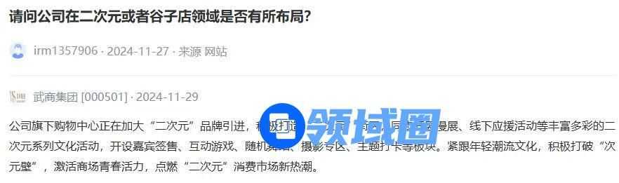 上市公司武商集团旗下的商场武商梦时代专门劈开一层,引入各类谷子店,已在当地小有名气。武商集团就在互动平台上表示,公司的购物中心正在加大“二次元”品牌引进,积极打造“二次元”街区,同步开展漫展、线下应援活动等丰富多彩的二次元系列文化活动,点燃“二次元”消费市场新热潮。
