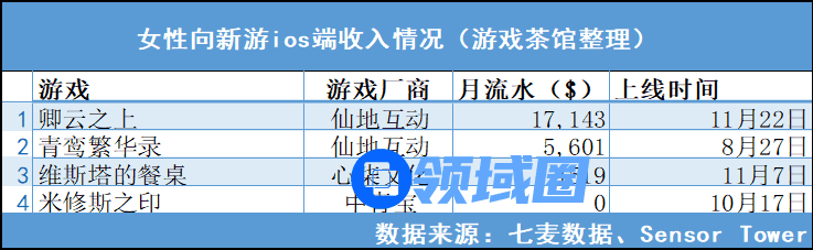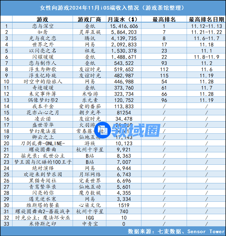 本次数据参照七麦数据和Sensor Tower商城,统计了11月1日至11月30日期间,各大女性向游戏在iOS端收入情况,为了解女性向游戏市场作参考。