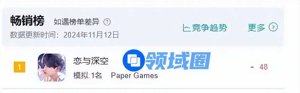 《恋与深空》在11月12日冲上iOS游戏畅销榜和iOS总榜第一,在女性向游戏上,《恋与深空》流水一骑绝尘,稳居第一。