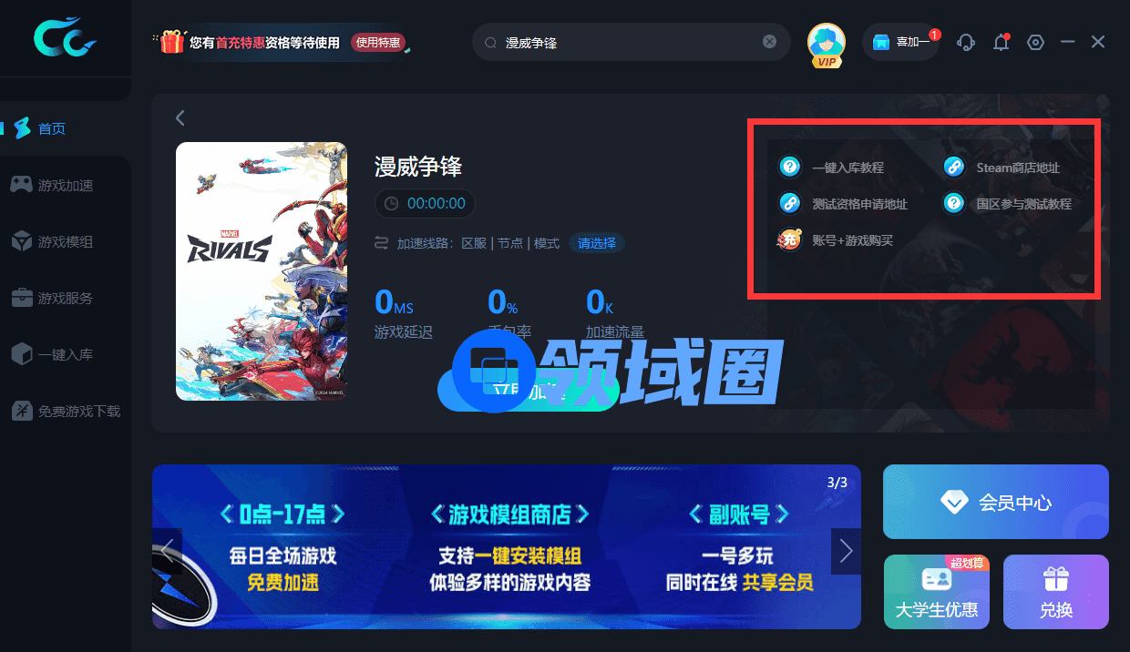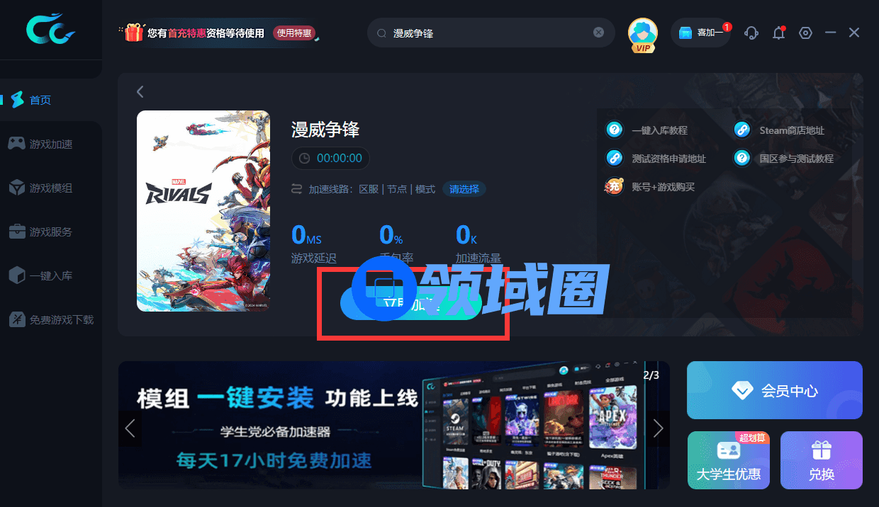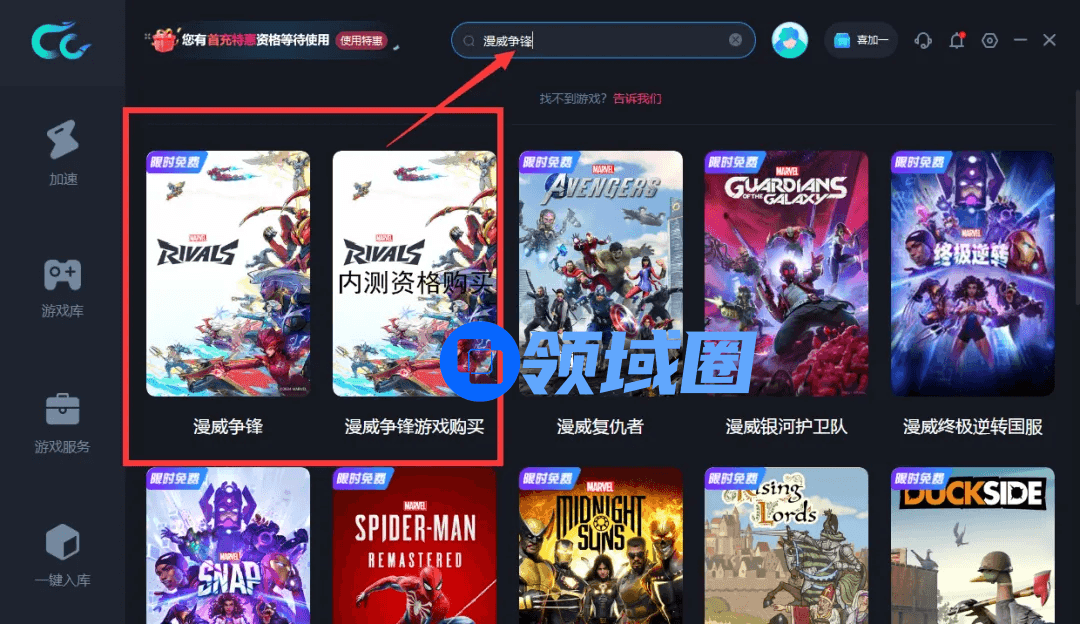 端游加速教程:打开CC加速器PC电脑版---搜索“漫威争锋”---点击【立即加速】