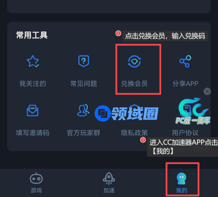 浏览器搜索“CC加速器官网”下载安装CC加速器APP,打开后进入【我的】--【兑换会员】,输入兑换码CCJSQ999,即可兑换成功。兑换成功后底部会有弹窗提示,玩家需退出后台CC加速器APP重新进入,进入【我的】查看会员到期时间。