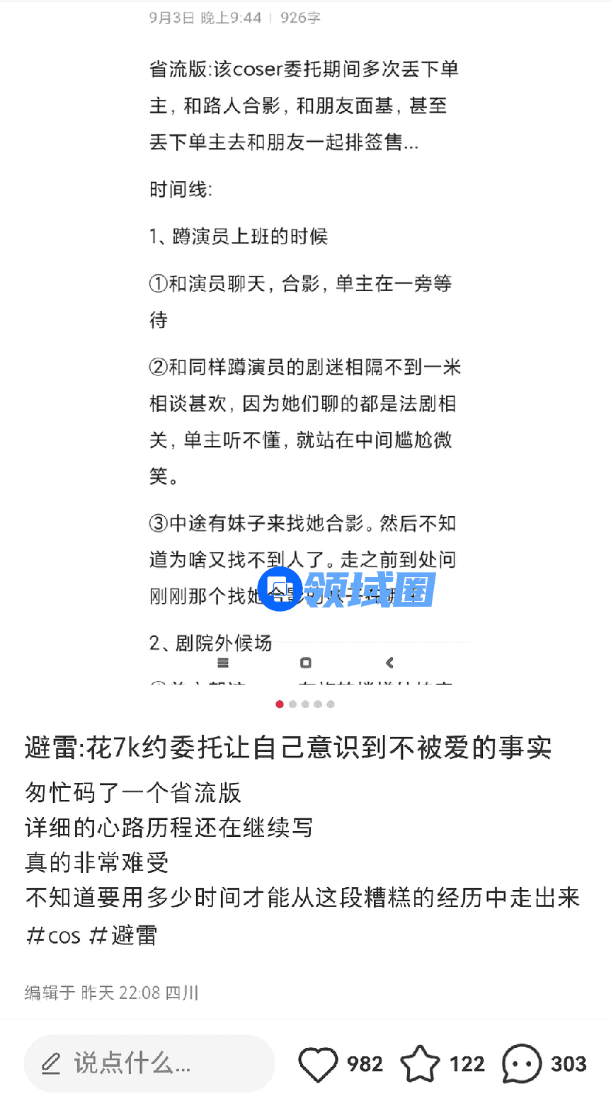 风险也在疯狂扩圈的市场中滋生。不少coser照片和真人相差过大,突然推掉单子,影响单主一天的行程,男性混入其中让单主风险增大。有人吐槽在委托期间coser多次把自己丢下,“花七千约委托让自己意识到自己不被爱”。另一边,coser也有被性骚扰的风险。