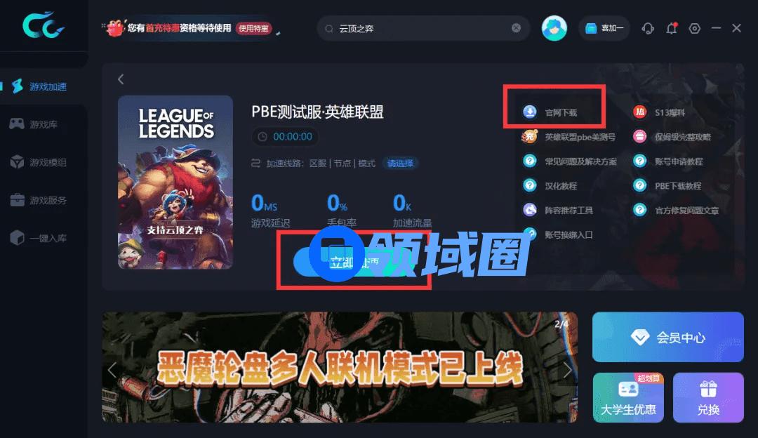 端游加速教程:打开CC加速器PC电脑版---搜索“云顶之弈”---选择区服【英雄联盟国际服】、【PBE测试服 · 英雄联盟】---点击右侧【官网下载】---安装成功后回到CC加速器点击【立即加速】