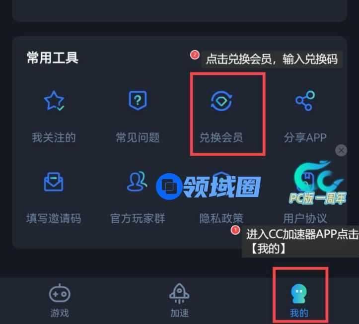 浏览器搜索“CC加速器官网”下载安装CC加速器APP,打开后进入【我的】--【兑换会员】,输入兑换码CCJSQ999,即可兑换成功。兑换成功后会弹窗提示,玩家需退出后台APP重新进入CC加速器,进入【我的】查看会员到期时间。