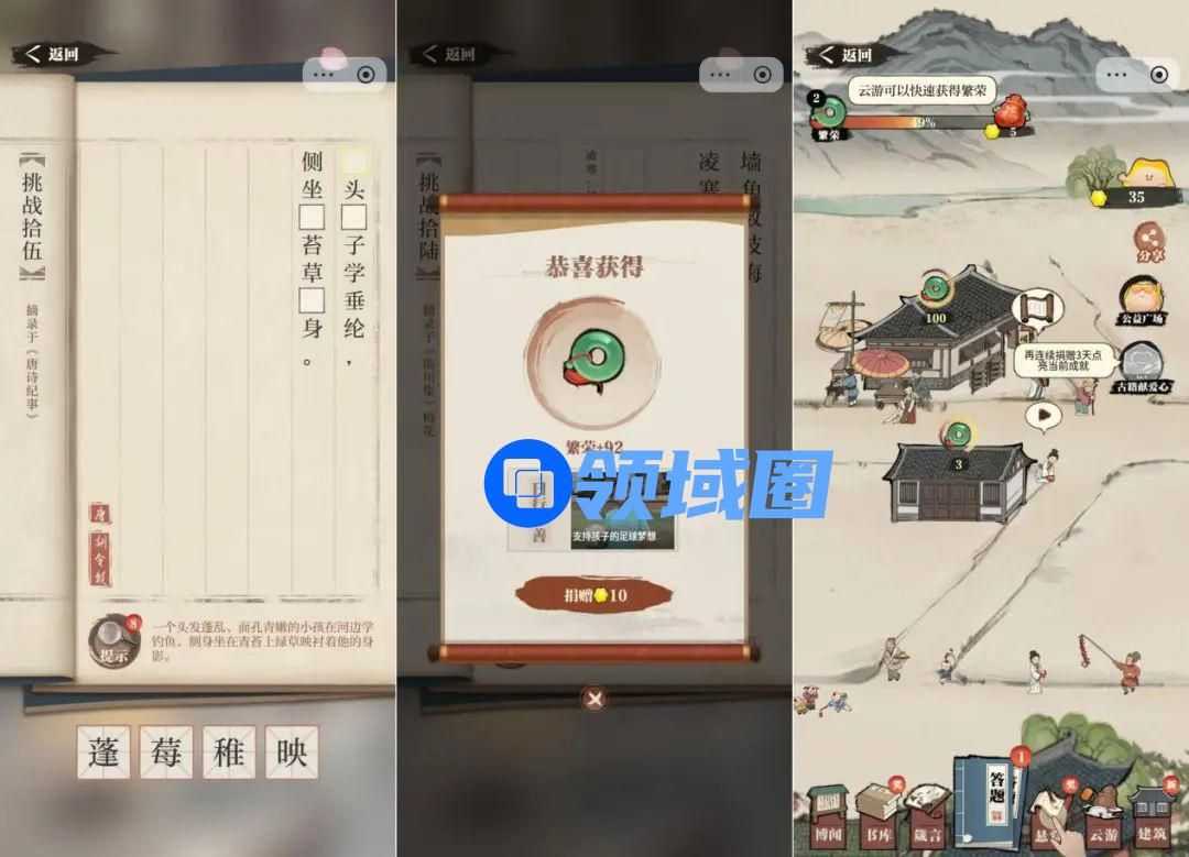 《古籍寻宝记》结合了古诗词答题和模拟经营,玩家只要通过答题完成诗词填空,就能获得建筑奖励和公益捐赠奖励,获得的建筑还会自动产生收益,提升城镇的繁荣度,最终达到寓教于乐的效果。