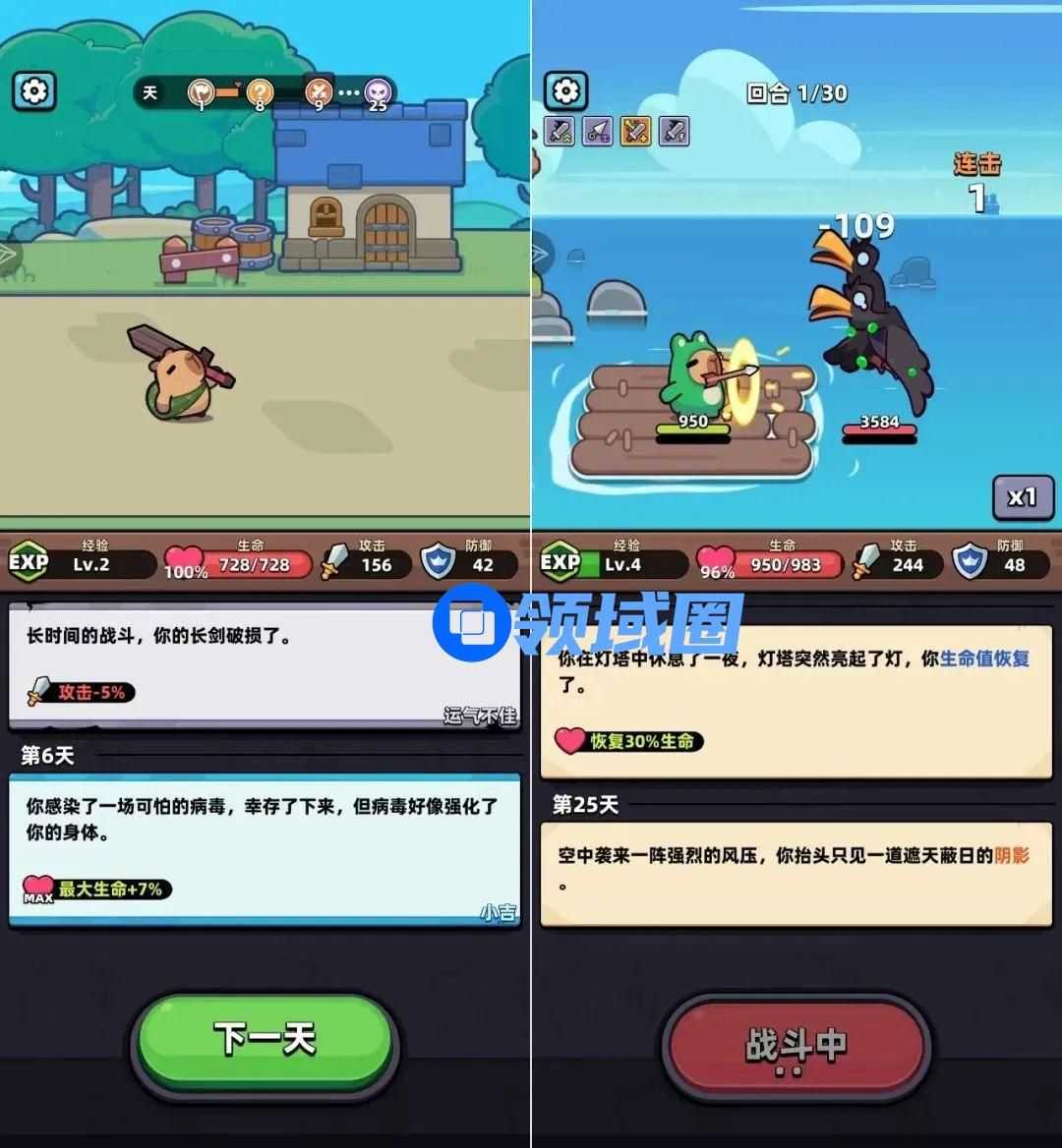 从玩法上来看,该游戏是一款结合了肉鸽元素的文字冒险类游戏。游戏主线以关卡形式呈现,玩家将通过一天又一天的方式开启冒险,每一天角色都会遇到各种随机事件,比如武器破损、突然感染病毒、遇到可供休息的灯塔等等,这些事件会直接影响攻击、防御、生命、经验值等角色属性。