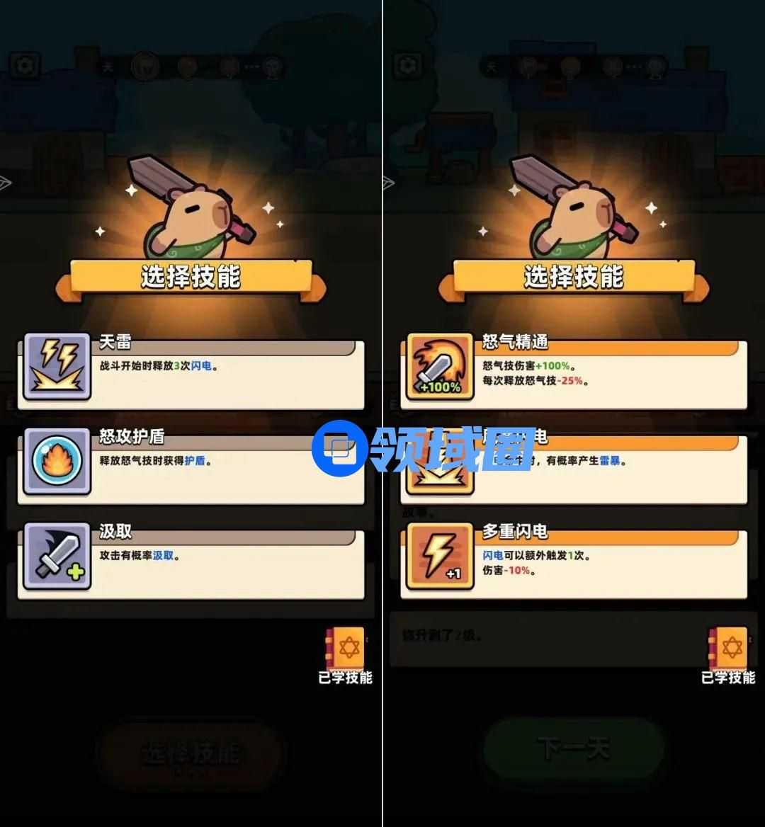 玩家可根据自身偏好,对系统随机提供的技能,进行自由选择和搭配,形成普攻、暴击或吸血等不同技能流派,来对抗冒险途中的敌人。最终只要角色能够顺利活过对应天数,即算闯关成功。