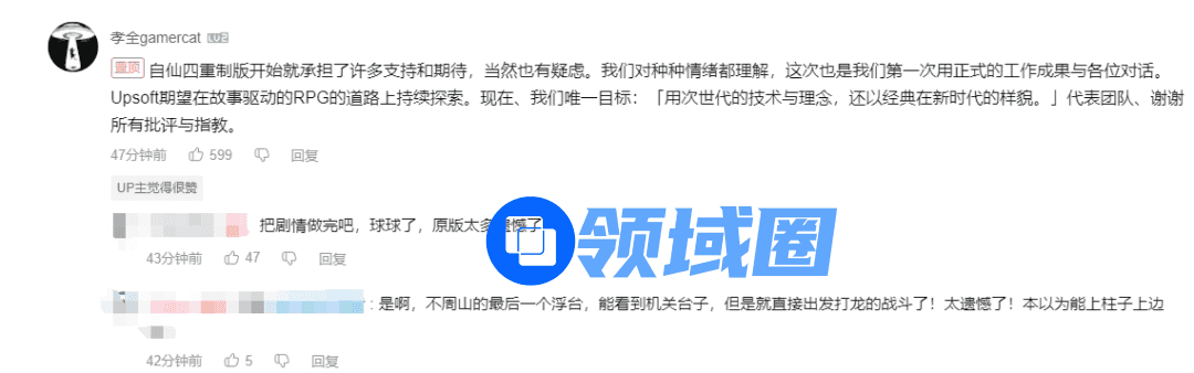 张孝全也在PV下方发表了评论:“自仙四重制版开始就承担了许多支持和期待,当然也有疑虑。我们对种种情绪都理解,这次也是我们第一次用正式的工作成果与各位对话。Upsoft期望在故事驱动的RPG的道路上持续探索。现在、我们唯一目标:「用次世代的技术与理念,还以经典在新时代的样貌。」代表团队、谢谢所有批评与指教。”
