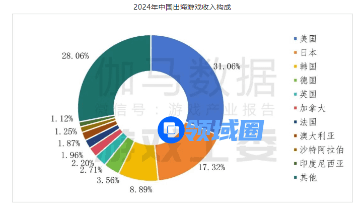 2024年,国内自主研发游戏在海外市场终于一转颓势,在收入连续两年获得负增长后,今年,其在海外市场的实际销售收入为185.57亿美元,同比增长13.39%。其中,移动游戏的出海收入占比前五的国家为美国(31.06%)、日本(17.32%)、韩国(8.89%)、德国(3.56%)和英国(2.71%)。此外,得益于近年来的经济多元化转型和国内游戏企业的跟进,沙特也首次进入中国出海收入地区TOP10。