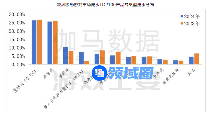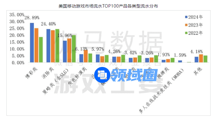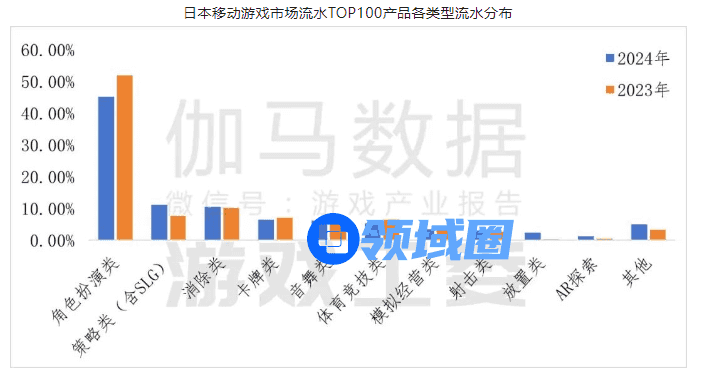 聚焦到不同地区更具体来说,在美国,博彩类、消除类以及策略类(含SLG)仍是流水收入的“扛把子”。在欧洲,策略和消除类流水占比合计超过五成。在日本,RPG仍是市场流水贡献的王者,占比高达45%。