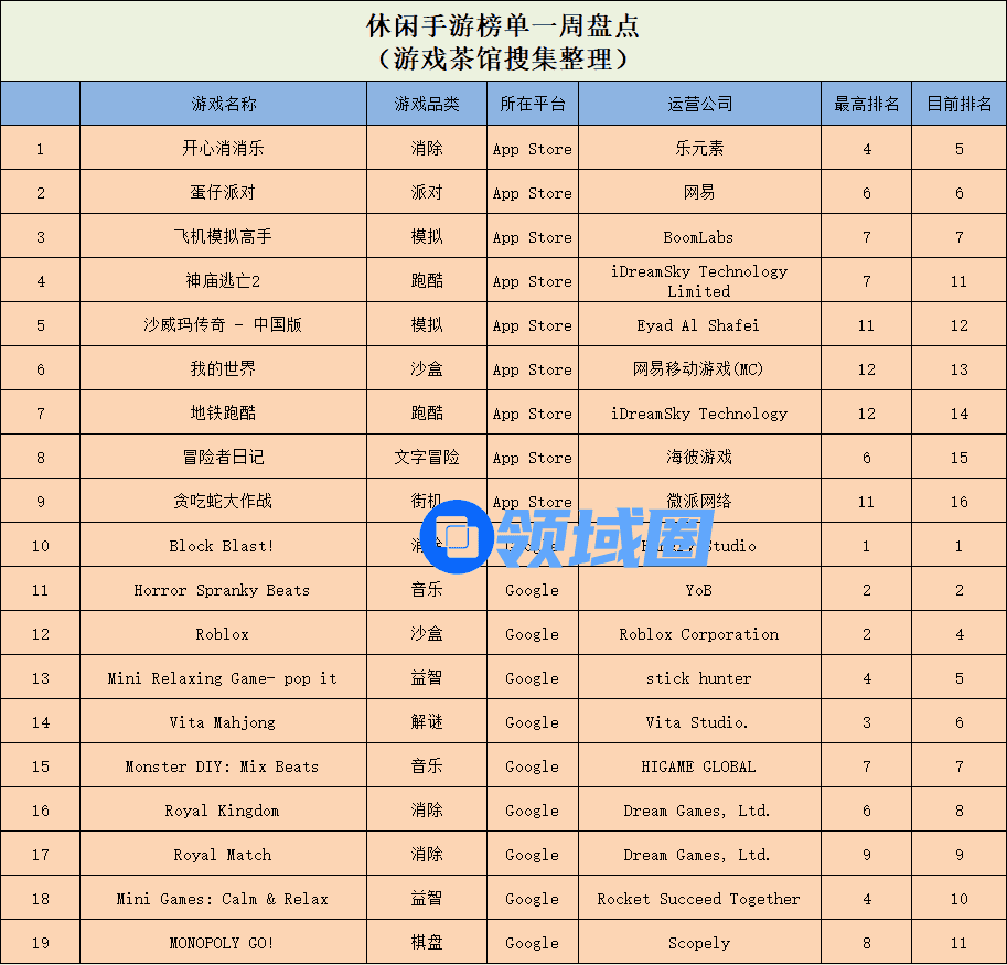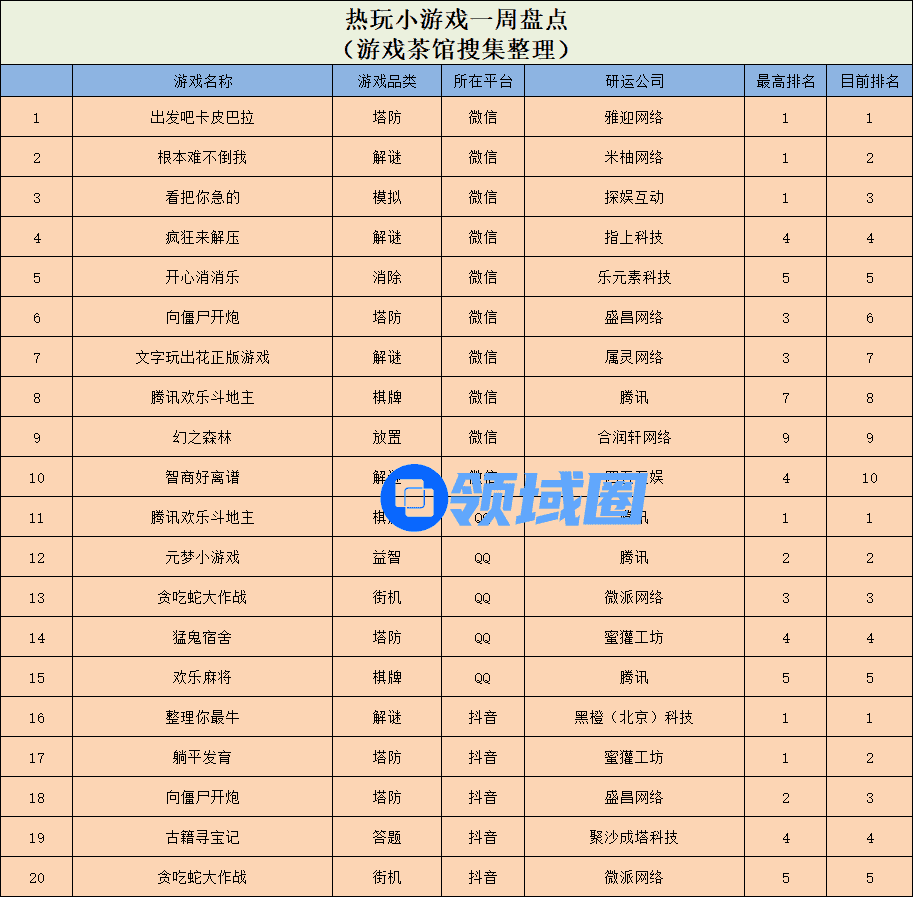 休闲新游周报每周统计微信小游戏、QQ小游戏、抖音小游戏、硬核小游戏以及App Store和Google Play上的新游爆款,并按照分类制作表格,将游戏排名情况等信息公布,希望给到行业同侪帮助。