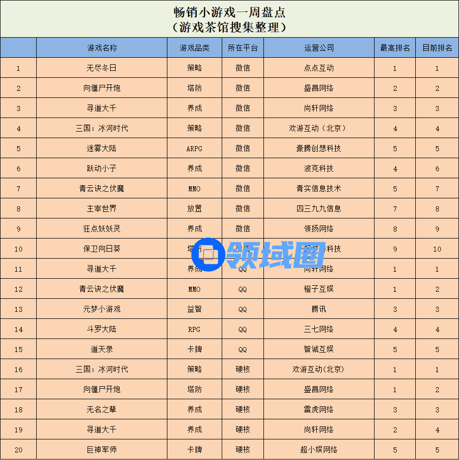 在硬核小游戏畅销榜单中,策略游戏《三国:冰河时代》稳稳拿下榜单第1,大梦龙途的塔防小游戏《向僵尸开炮》和三七互娱旗下的《无名之辈》分别位列榜单第2和第3名。同时,卡牌玩法的《巨神军师》本周也拿下了畅销榜TOP5的好成绩。