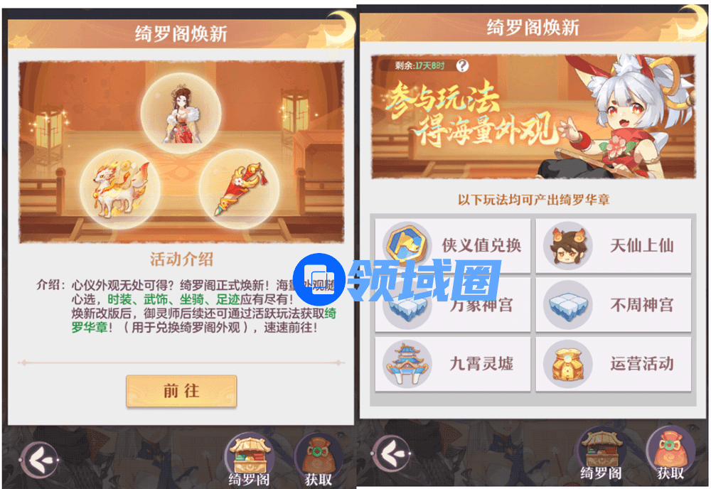 绮罗丛里一回眸,歌尽繁华几度秋。绮罗阁大幅焕新,限定外观齐返场!热门外观活跃兑换,通过每日活跃、天霞锦和活动置换,开启全民高颜值时代。版本更新后,御灵师可于新版绮罗阁中兑换武饰、坐骑、时装、足迹等各类珍品外观。绮罗阁中的外观商品将定期轮替上新,所有限定(不含联动)外观均有机会返场。